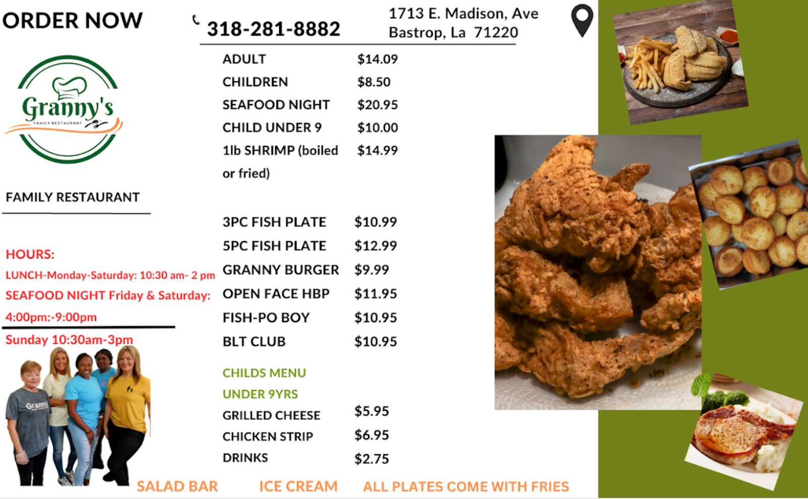 Granny's Family Restaurant stands as a beloved cornerstone of Southern hospitality and authentic home-style cooking. This family-owned establishment has cultivated generations of loyal patrons who return time and again for food that tastes exactly like home. The restaurant's reputation rests firmly on its exceptional fried specialties. Their crispy, hot catfish fillets draw praise from newcomers and longtime customers alike. The fried chicken? Simply amazing. These aren't just menu items—they're crafted traditions that have satisfied families for years. But Granny's extends far beyond excellent fried fare. The establishment offers an extensive buffet featuring genuine soul food selections that showcase the rich culinary heritage of the South. Black-eyed peas prepared to perfection. Cabbage seasoned with just the right touch of ham. Fresh, homemade bread that customers can't wait to experience again. The menu boasts remarkable variety, ensuring something special for every family member. Tender pork chops. Chicken and spaghetti—a customer favorite unavailable elsewhere. Fresh seafood offerings grace Friday and Saturday evenings, transforming ordinary weekends into culinary celebrations. Desserts deserve their own recognition. The cobbler has achieved legendary status among regulars, providing the perfect sweet conclusion to hearty meals.
