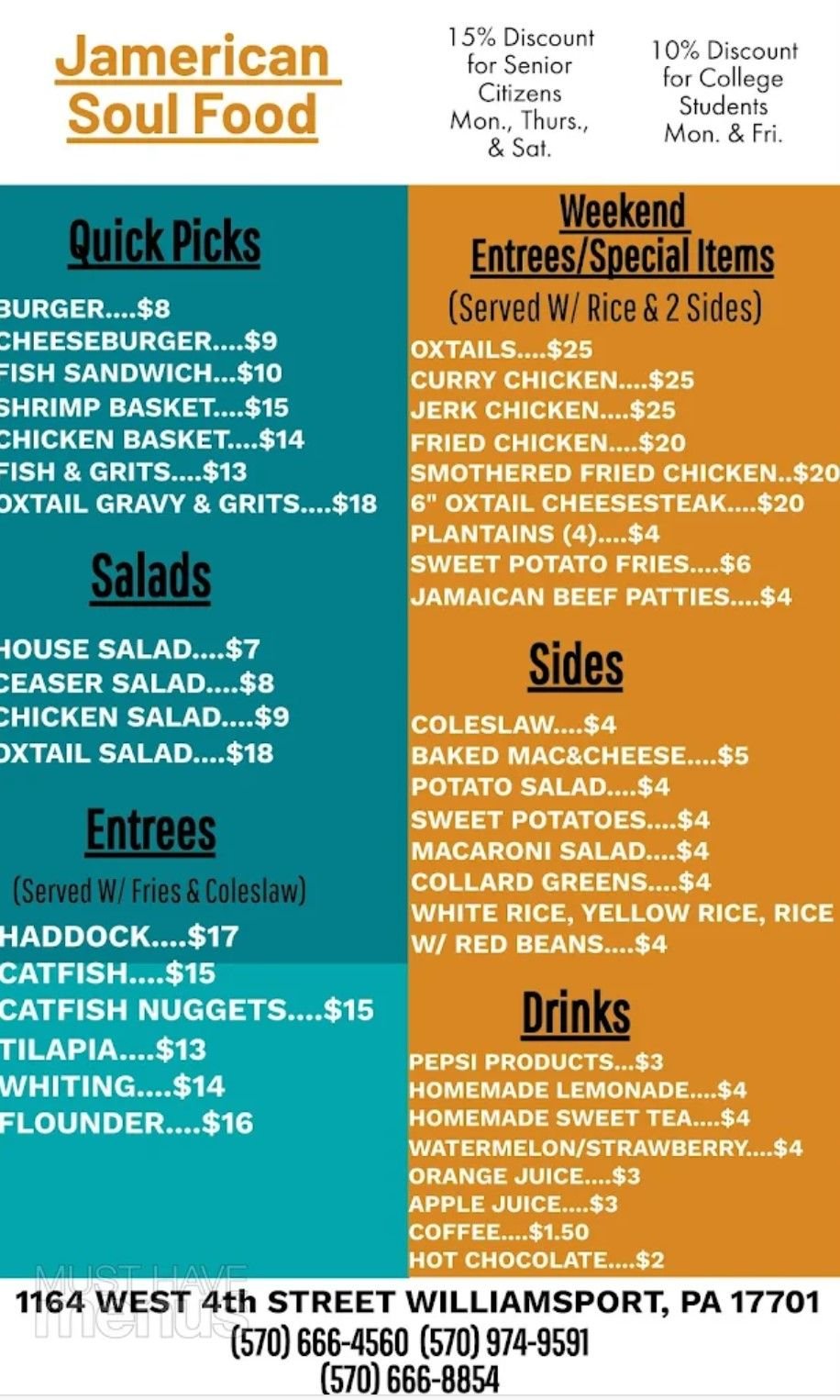 In the heart of Williamsport, PA, Jamerican Soul Food stands as a vibrant culinary crossroads where American soul traditions embrace Jamaican flavors with passionate authenticity. Founded by Sampson, whose warm presence infuses the establishment with genuine hospitality, this unique eatery has carved a distinctive niche in the local dining landscape. The kitchen orchestrates a symphony of tastes that dance between continents—from fall-off-the-bone oxtails simmered to perfection to jerk chicken radiating with island spices. Every dish emerges from their kitchen with meticulous attention to detail, whether it's their celebrated seafood platters featuring delicate flounder or their hearty curry goat that transports diners straight to Caribbean shores. What separates Jamerican from ordinary establishments isn't merely the generous portions that transform one meal into two, but their unwavering dedication to serving food that arrives piping hot and bursting with flavor. Their sides—from the crispy, seasoned Cajun fries to velvety baked mac and cheese and perfectly braised cabbage—receive the same careful consideration as their main attractions.